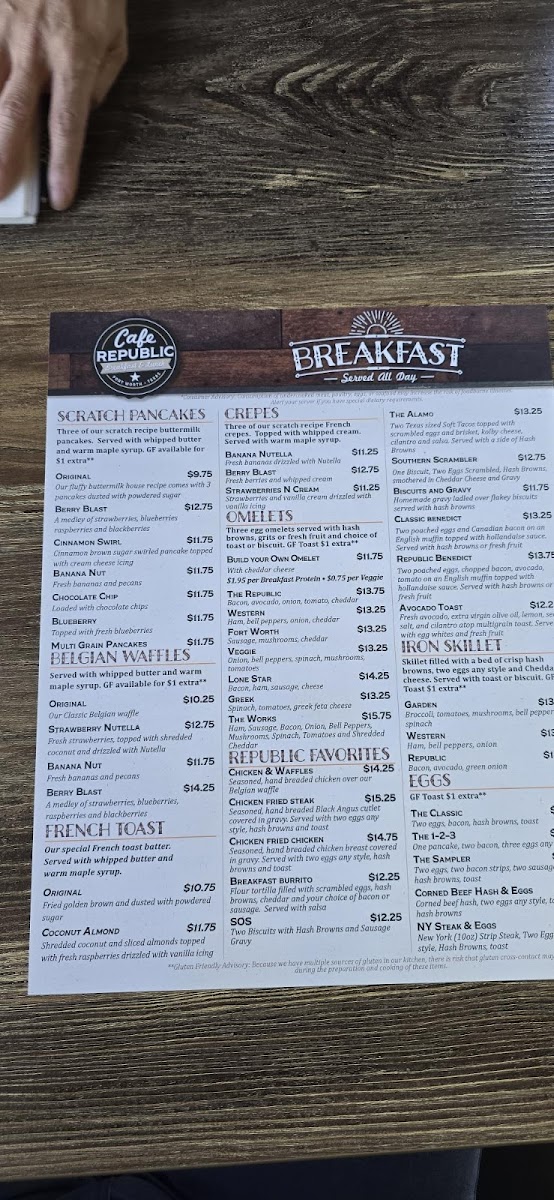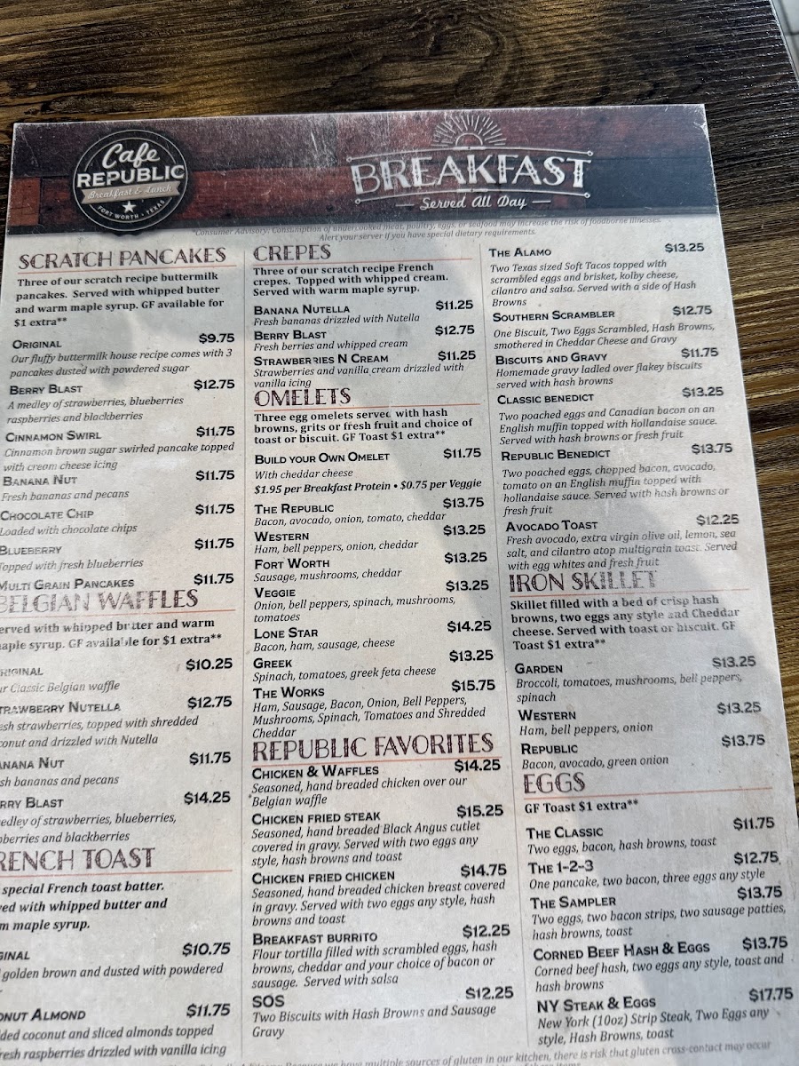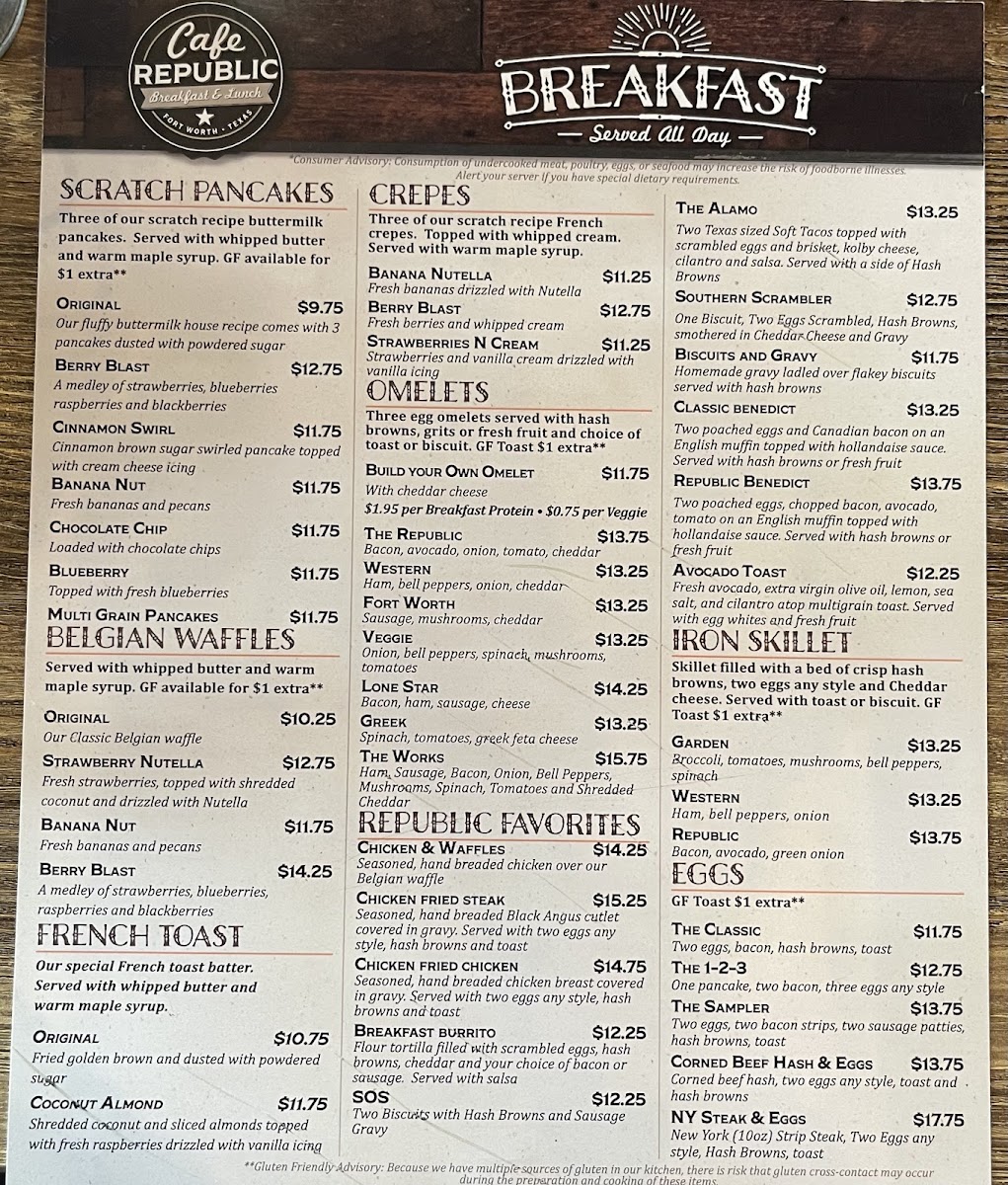 Seasoned, hand breaded chicken breast covered in gravy. Served with two eggs any style, hash browns and toast